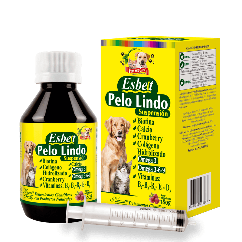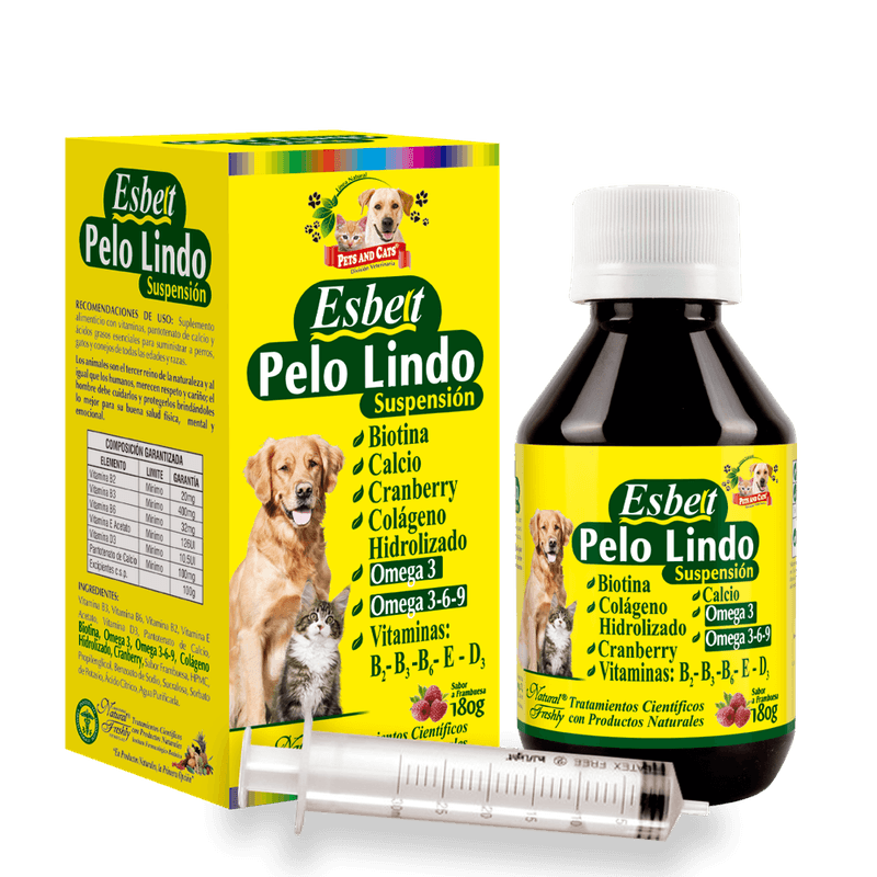 ESBELT PELO LINDO Suspensión es la mejor opción para mantener un pelaje fuerte, brillante y sedoso. Su fórmula con Cranberry, un poderoso antioxidante, protege el pelo de tu mascota evitando su deterioro y manteniendo su aspecto saludable.